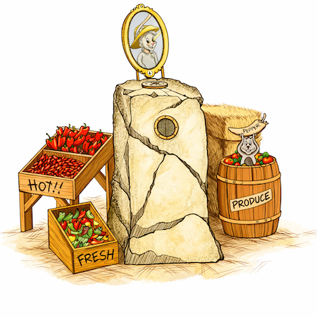 A garden or field-edge scene with barrels, planters, or produce displays that come to life through sound, motion, or light.